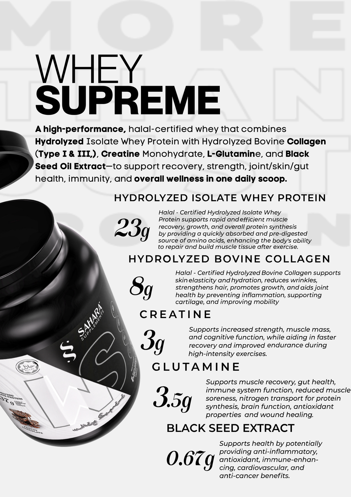 Whey Supreme is not your average protein supplement. In addition to hydrolyzed isolate whey protein, it includes hydrolyzed collagen for joint and skin health, creatine for enhanced strength and performance, glutamine for muscle recovery, and black seed oil extract for its antioxidant and wellness properties. It’s designed to support your holistic health journey.