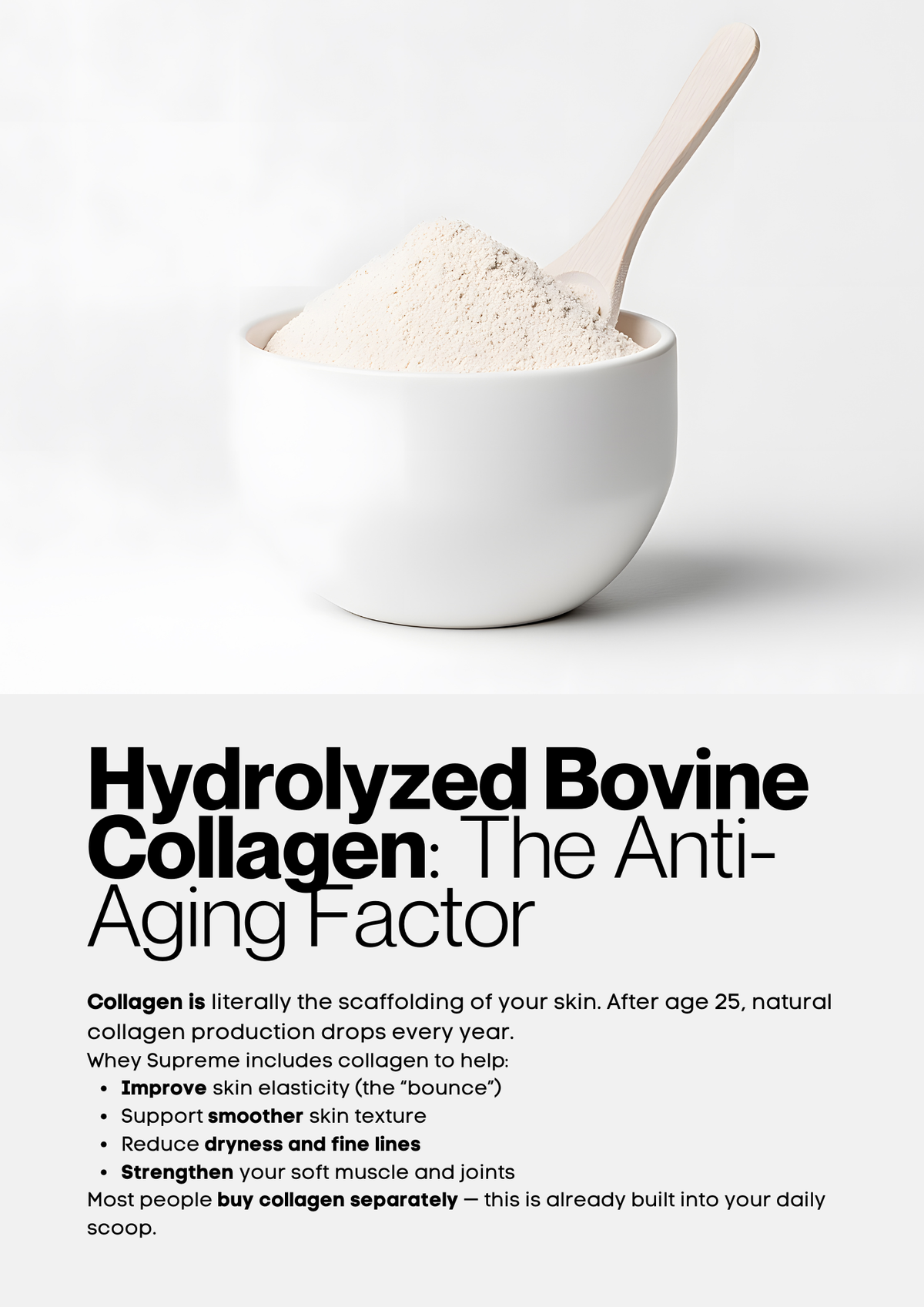 Collagen supports joint health, skin elasticity, and overall recovery. It’s essential for maintaining resilience in both your workouts and daily life, helping you stay strong and mobile.